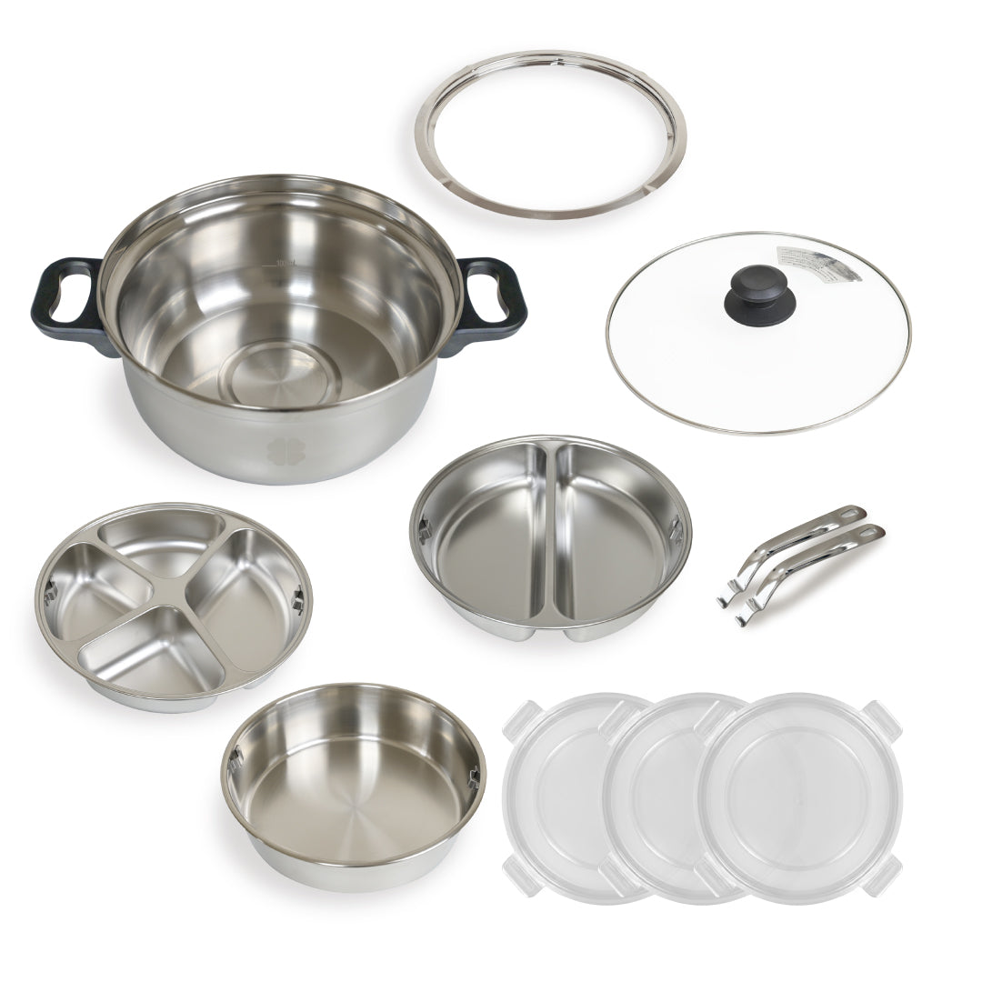 丈夫でサビに強い ステンレス製の11点セット鍋 です。蒸す・煮る・温める・作り置き・保存まで、これ1つで幅広く使えます。