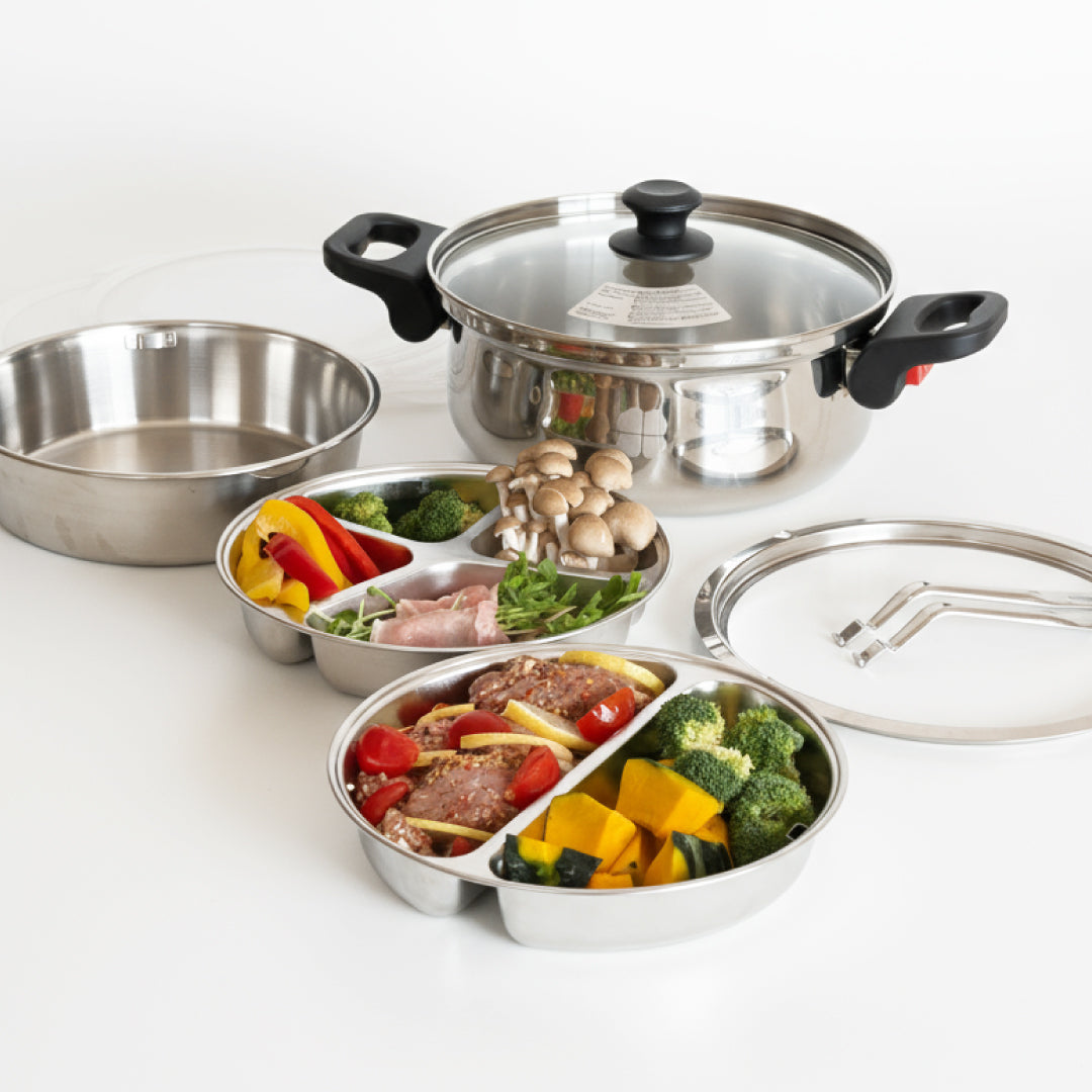 3種類のトレーで、食材を分けながら効率よく調理できます。毎日の料理をスムーズにしてくれる万能セットです。